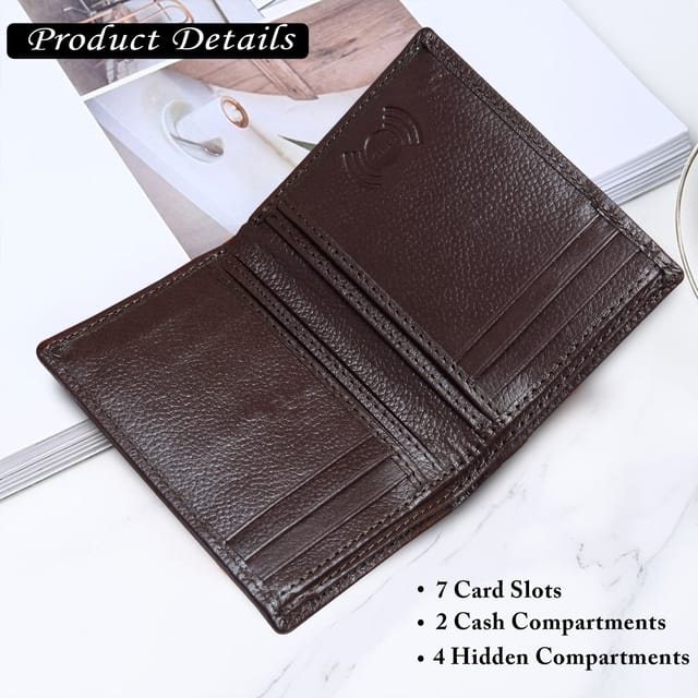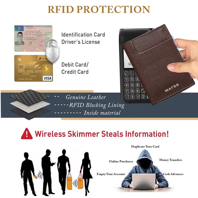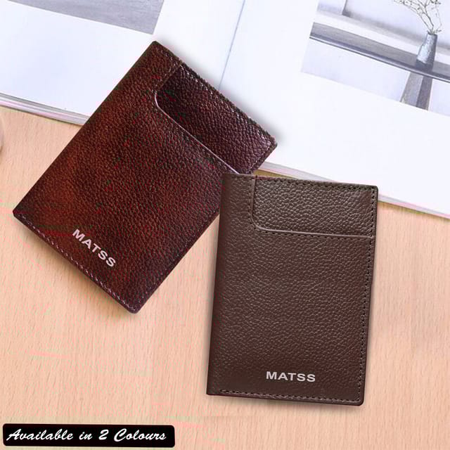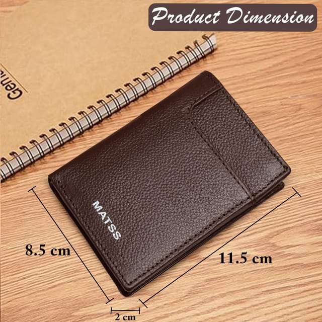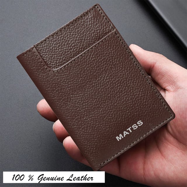 MATSS presents a high-quality genuine leather card holder-stylish and functional. The sleek design and expert stitching makes this credit card wallet perfect for men and women. It has 6 card slots, 2 cash compartments for folded cash, 4 hidden compartments inside, and 1 outer pocket for card, cash. Its slim and lightweight design makes it easy to carry in pocket, making it suitable for both personal and professional use. Keep your sensitive information safe with advanced RFID-blocking technology. The front accents MATSS iconic metallic logo often convey a sense of luxury, durability, and professionalism. It's a thoughtful gift option for anyone looking for a practical yet stylish wallet.
